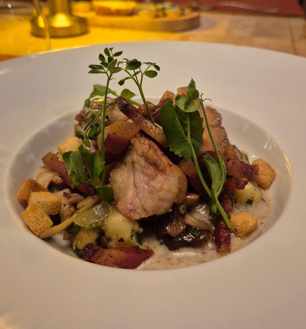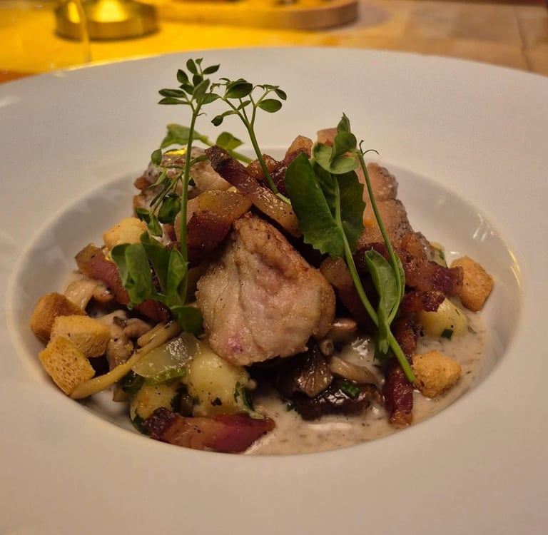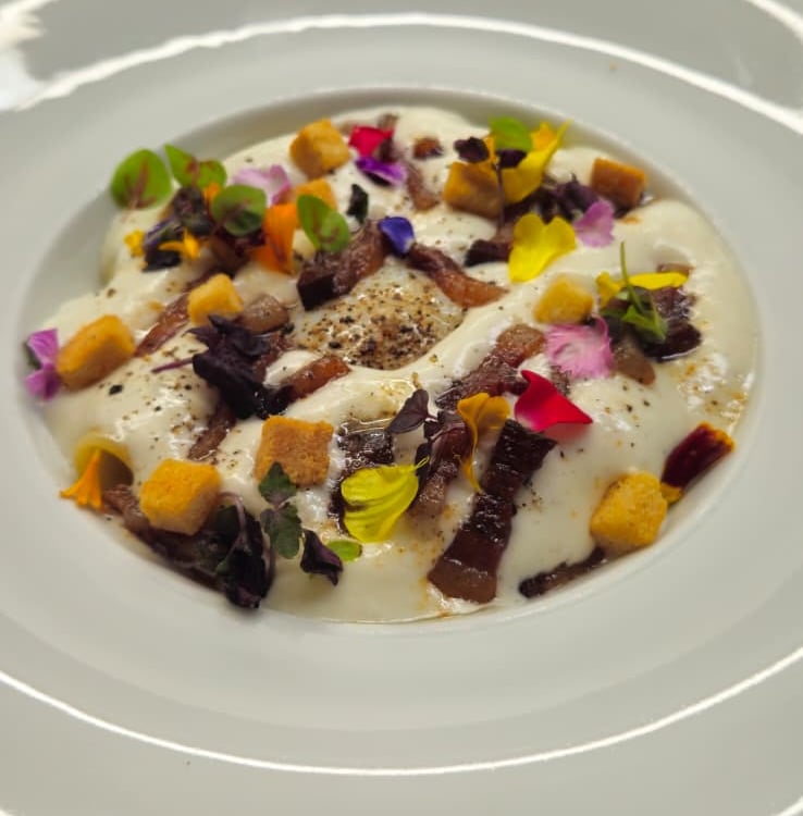 Œuf parfait façon carbonara, guanciale, crème de pecorino, poivre noir *