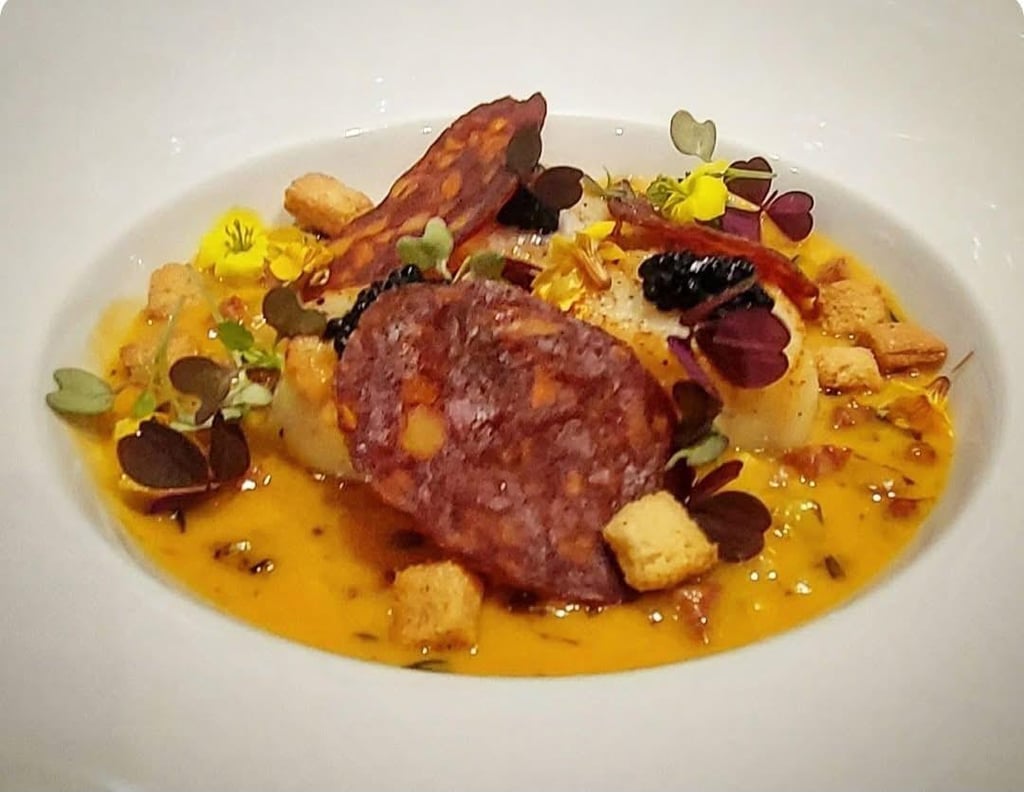 Saint Jacques poêlées, crème de chorizo, courgettes, perles d’Avrugha, pignons de pin *