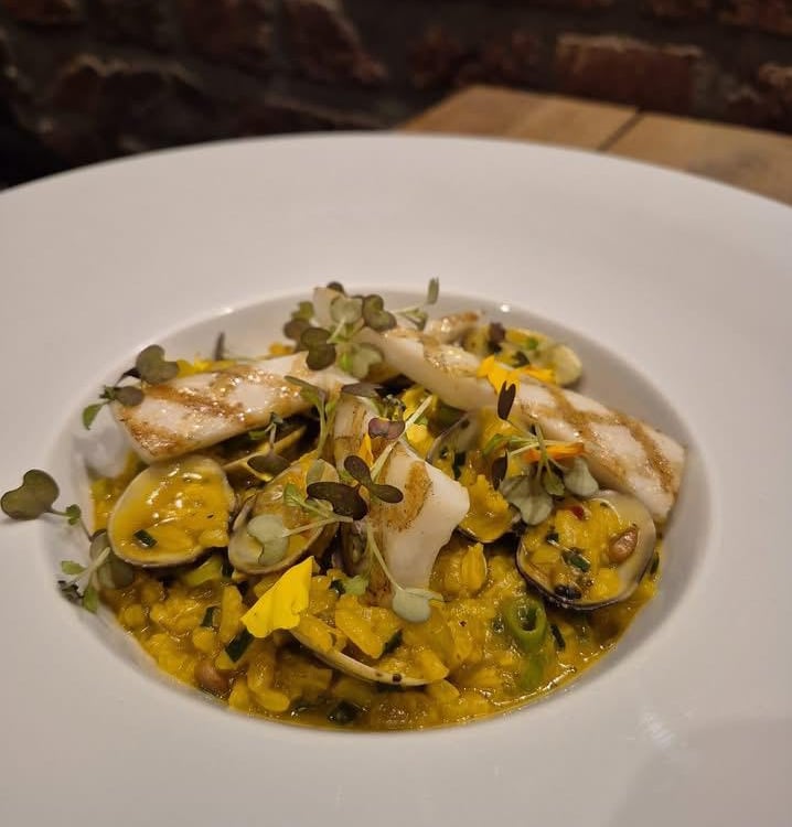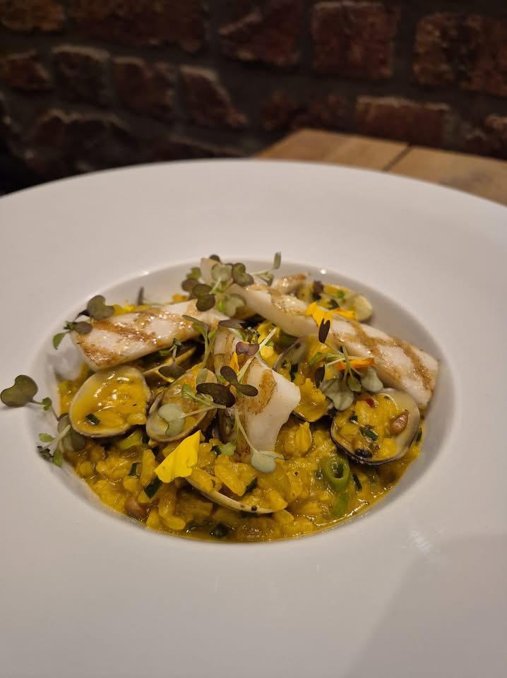 Risotto au safran, calamars grillés, chaire de palourde, herbes fraiches et croutons *