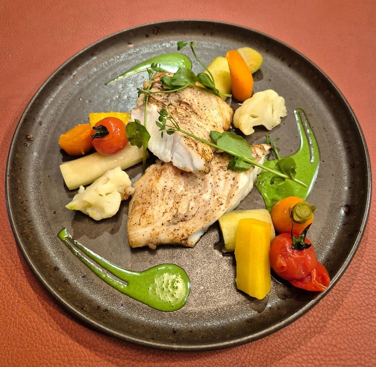 Églefin, crème d’épinards à l’ail, mousseline de pommes de terre, poireaux confits *